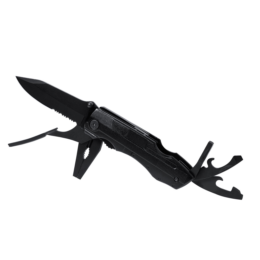 Navaja multiusos de acabado negro en acero inoxidable y resistente empuñadura a juego en aluminio. De diseño plegable y tamaño compacto. Incluye 10 funciones: - Destornillador con múltibles cabezales- Cuchillo de filo liso y dentado-Abrebotellas- Abrelatas- Alicates con cortador de hilosPresentada en práctico estuche de poliéster a juego con accesorio para cinturón.Manta Térmica